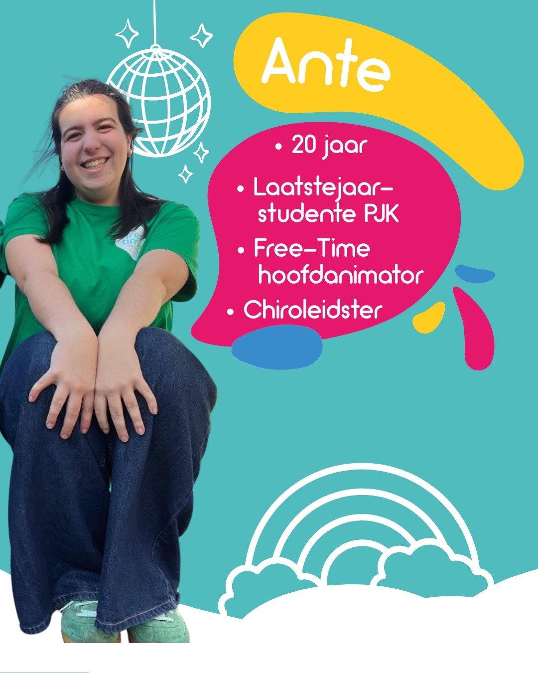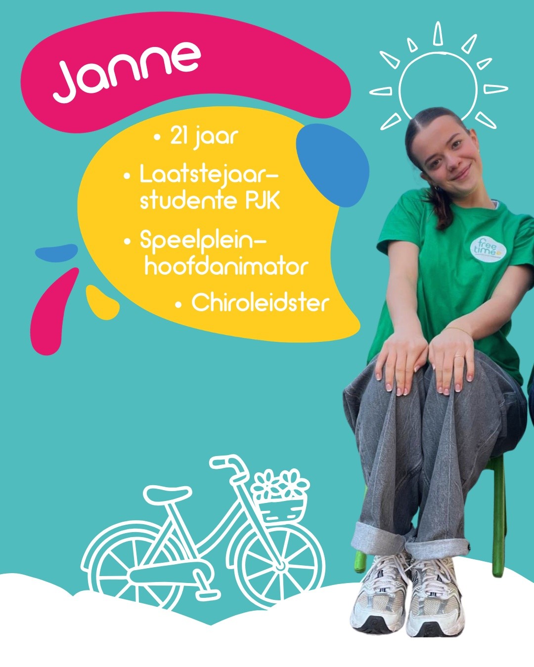 Wij zijn Janne & Ante, beide laatstejaarsstudentes Pedagogie van het Jonge Kind die stage lopen bij Free-Time. Je vindt ons dit jaar op de buitenspeeldag, animatorcursussen en onze kampen! Daarnaast helpen we vooral achter de schermen met elk ons expertiseveld: Janne zal zich helemaal smijten in de animatorvorming en Ante zet haar schouders onder de inclusiecases/-beleid!